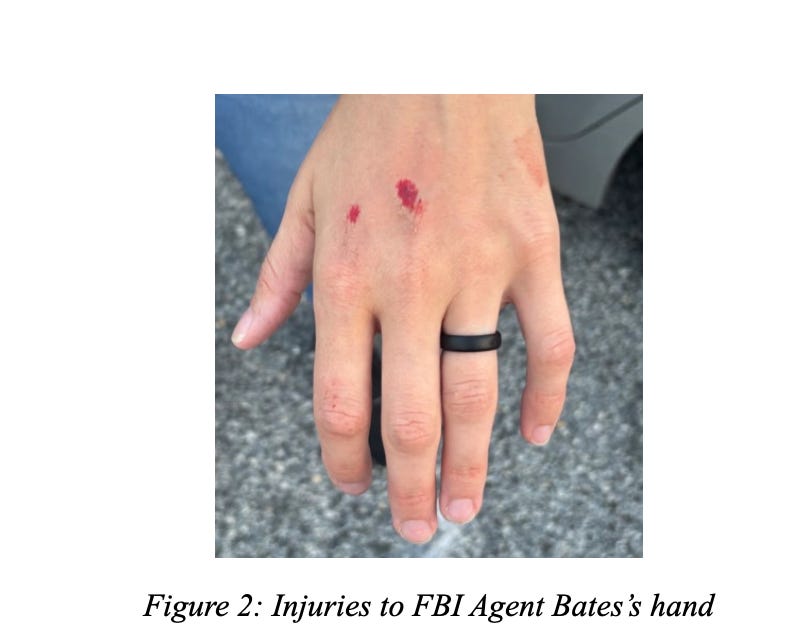 (Why the FBI agent near the wall in the first place? According to the Government’s statement of facts, the FNI agent and other law enforcement officers had pushed the alleged perpetrator against the wall and the injuries occurred during the shove. Sounds almost like “The defendants face repeatedly hit the officers fist causing injury to the officer’s arm.” The picture of the resulting injuries was also likely less than compelling to the jury.)