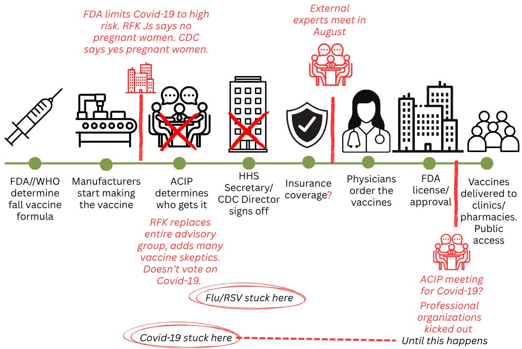 Flu and RSV vaccines have been relatively smooth this year, as they were reviewed and recommended by ACIP (CDC’s external advisory committee) in June. But the final sign-off for these typically straightforward vaccines still hasn’t happened. RFK Jr. did revoke authorization for flu shots with thimerosal (based on disproven claims) but has yet to sign off on other flu formulations or the new RSV monoclonal antibody for infants. That delay is highly unusual and potentially troubling, as it could signal plans to restrict access. It could be due to the CDC leadership vacuum (CDC just got a CDC Director last week), but it’s unclear why RFK Jr. would sign off on one thing but not the others.