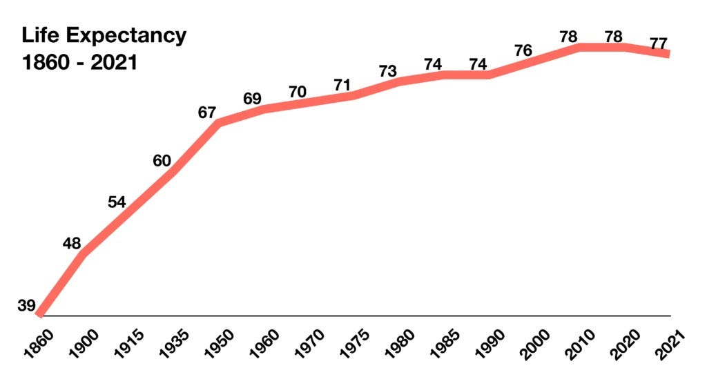 One of the great success stories about America has been the great strides we have made in our health. An average American born just 100 years ago had a life expectancy at birth of only 54. Even in 1950, the average life expectancy was only 69. Today—even after COVID and the opioid epidemic—the life expectancy is 79.2 years, which is a two year improvement over 2021.
