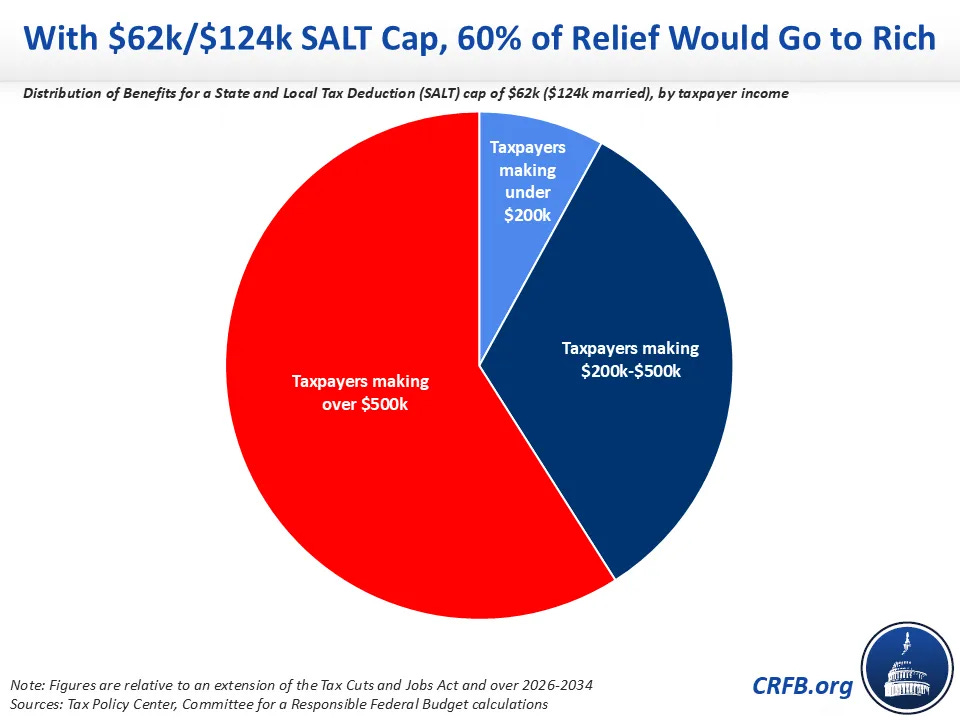 Even thought it is being pushed by so-called moderate Republicans, one of the worst examples of bad tax policy is the raising of the State and Local Tax deduction limit from $10,000 to $30,000 or higher. This will have no impact of growth, but will instead is a big tax giveaway to top income brackets in certain high tax states. (Until I retired from my law firm partnership, about half my Big Law partnership income came from New York, California and New Jersey, so I understand why folks want this. It is still bad policy). Fully 90% of tax payers never benefit from this tax decision because they use the standard deduction, and even among those who do itemize, the biggest beneficiaries of the deduction are in the highest income brackets.