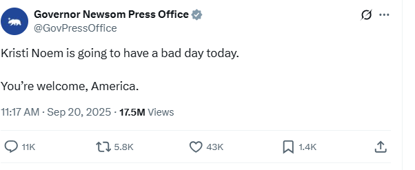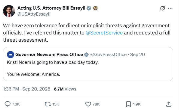 The context of the post was that later that day Governor Newsom signed legislation designed to protect immigrant communities that was directed to the Department of Homeland Security. Nonetheless, conservative posters alleged that this was an illegal threat of violence, and Department of Homeland Security spokesperson Tricia McLaughlin criticized the press office’s post, saying, “This reads like a threat.” The U.S. Attorney deemed this a threat against Noem and referred the matter to the Secret Service: